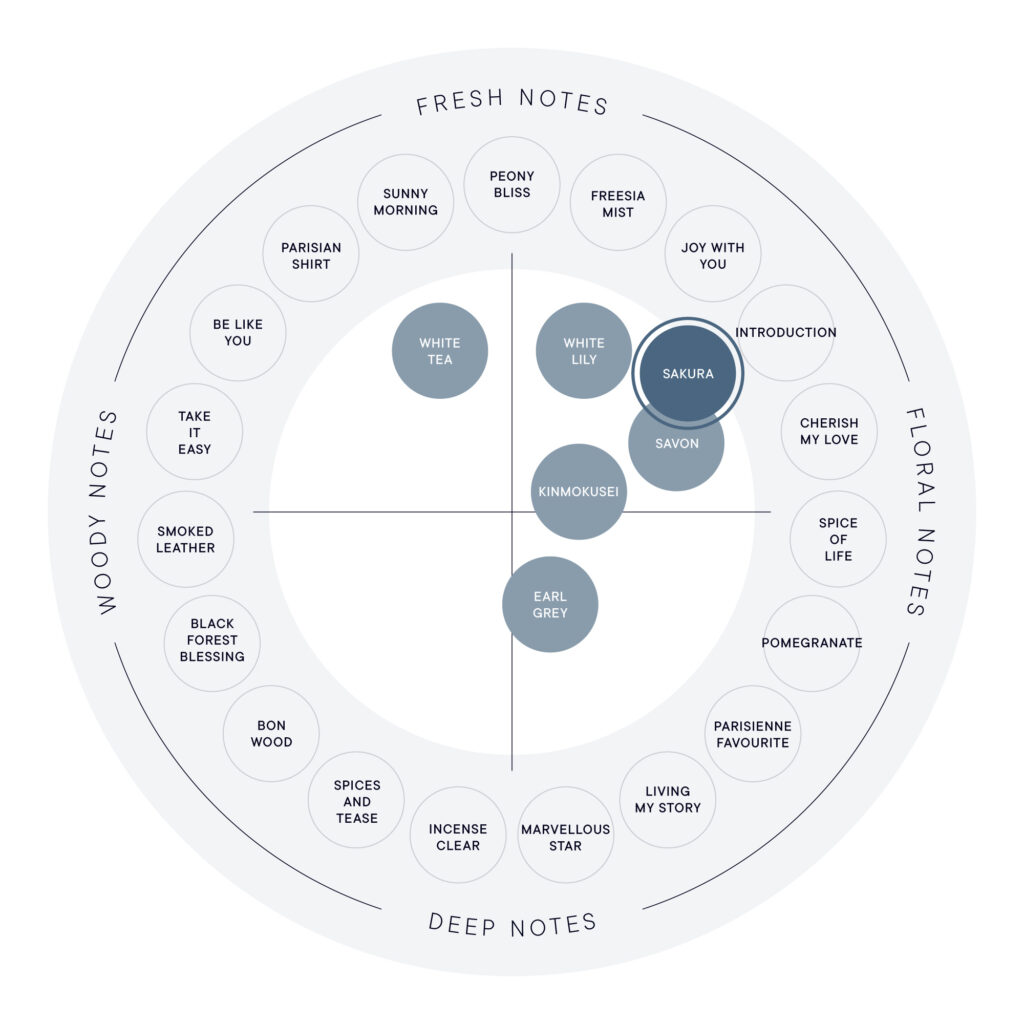 然而隨著時間流逝,人們對於香氣的知識與感受力也逐漸提升。因此,今年我們決定將其更新為更符合當代感性的全新「櫻花」香氣。經過多次試作後完成的,是一款彷彿將滿開櫻花緊緊凝聚其中的清新華麗香氣。